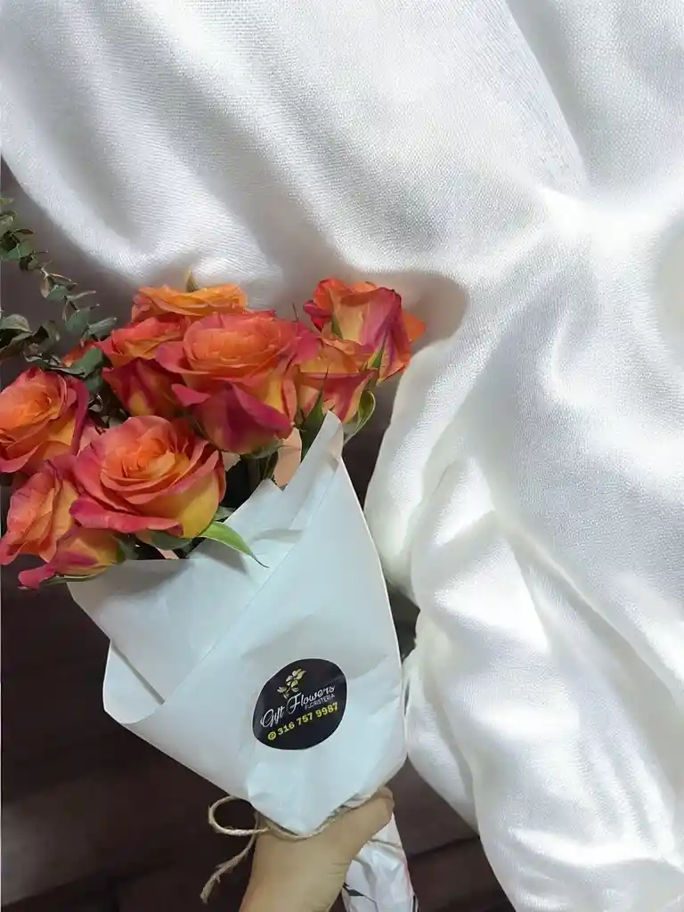 Bouquet con aprox 12 rosas naranjas y eucalipto. Nota: La flor puede ser sustituida dependiendo la disponibilidad de color y del producto “Mensaje Personalizado” máximo de 30 caracteres (Dejar el mensaje en el chat, los comentarios no se previsualizan para la tienda por lo que si se dejan allí no podrá ser incluido).