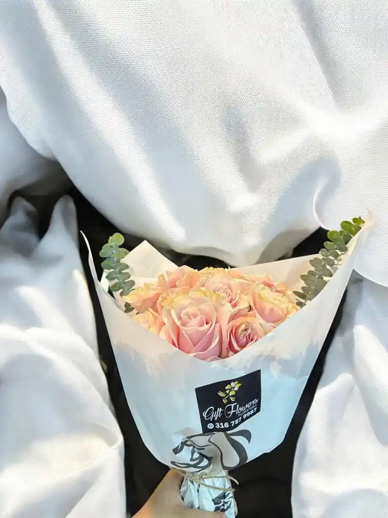 Bouquet de 12 rosas rosadas acopañadas de eucalipto. Nota: La flor puede ser sustituida dependiendo la disponibilidad de color y del producto “Mensaje Personalizado” máximo de 30 caracteres (Dejar el mensaje en el chat, los comentarios no se previsualizan para la tienda por lo que si se dejan allí no podrá ser incluido).