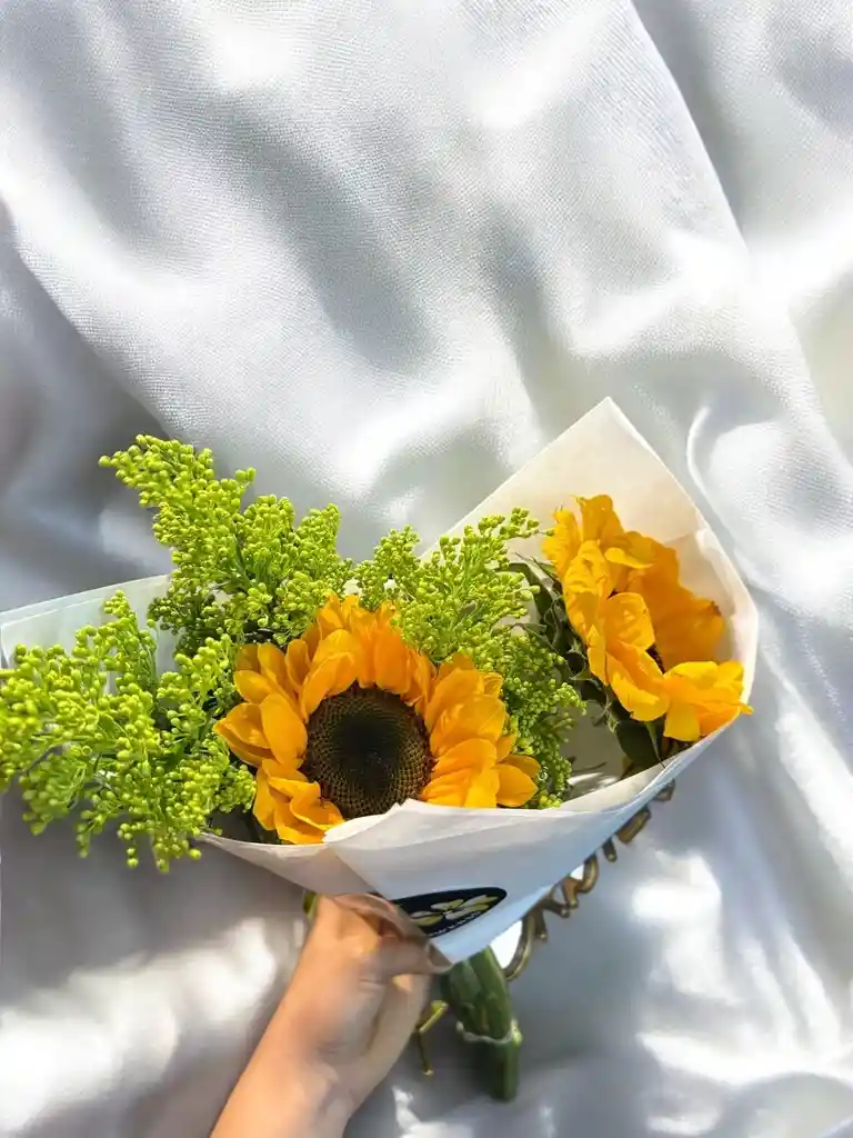 Bouquet de 2 girasoles con solidago. Nota: La flor puede ser sustituida dependiendo la disponibilidad de color y del producto “Mensaje Personalizado” máximo de 30 caracteres (Dejar el mensaje en el chat, los comentarios no se previsualizan para la tienda por lo que si se dejan allí no podrá ser incluido).