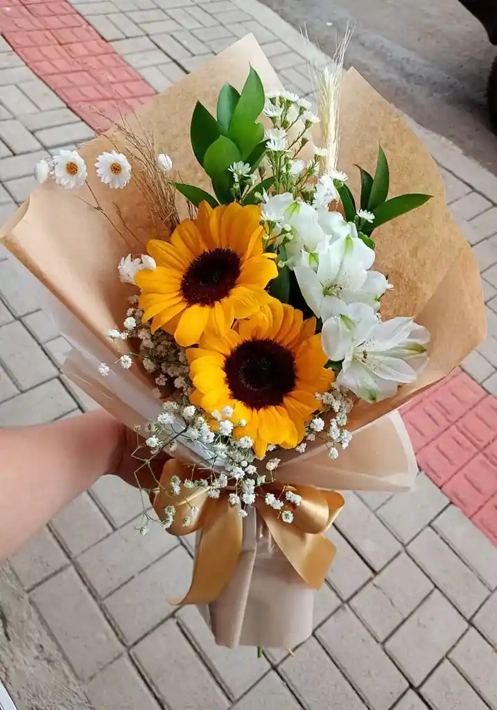 hermoso bouquet de 2 girasoles, acompañados de rusco y gipsofilia, ideal para sacar risas y un destello de amor