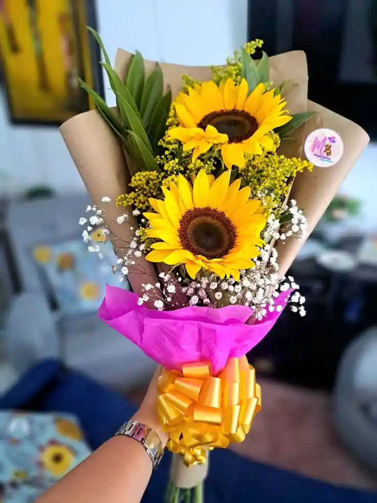 Un hermoso ramo de girasoles vibrantes , perfecto para iluminar cualquier día. Incluye dos girasoles principales, acompañados de gipso y rusco