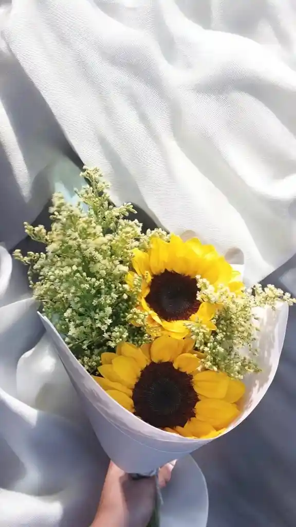 Bouquet con aprox. 2 girasoles y gypsophila. Nota: La flor puede ser sustituida dependiendo la disponibilidad de color y del producto “Mensaje Personalizado” máximo de 30 caracteres (Dejar el mensaje en el chat, los comentarios no se previsualizan para la tienda por lo que si se dejan allí no podrá ser incluido).