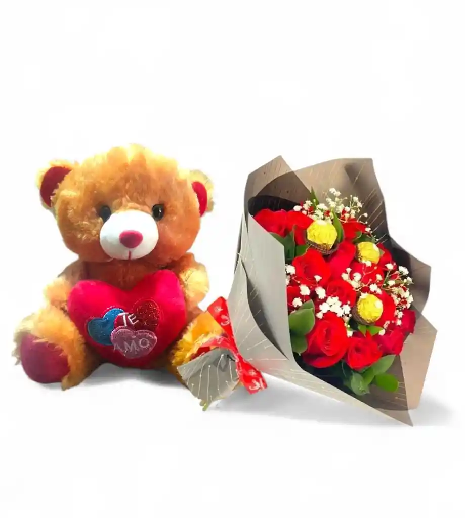 Bouquet de 24 rosas rojas con follajes, 3 unidades de chocolates ferrero y peluche 30 cm.