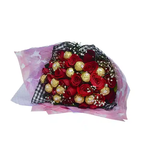 Bouquet de 24 rosas rojas más follaje Decoración más moño. mas pañoleta más Ferrero por 12Con descuento del 10%