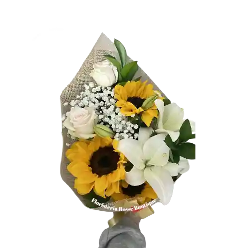 Hermoso bouquet natural y elegante compuesto por 3 girasoles, 2 rosas blancas, 1 lirio blanco y delicado follaje verde que resalta cada flor. Una combinación fresca y armoniosa que transmite luz, paz y admiración Ideal para cumpleaños, agradecimientos, celebraciones familiares o detalles llenos de significado.