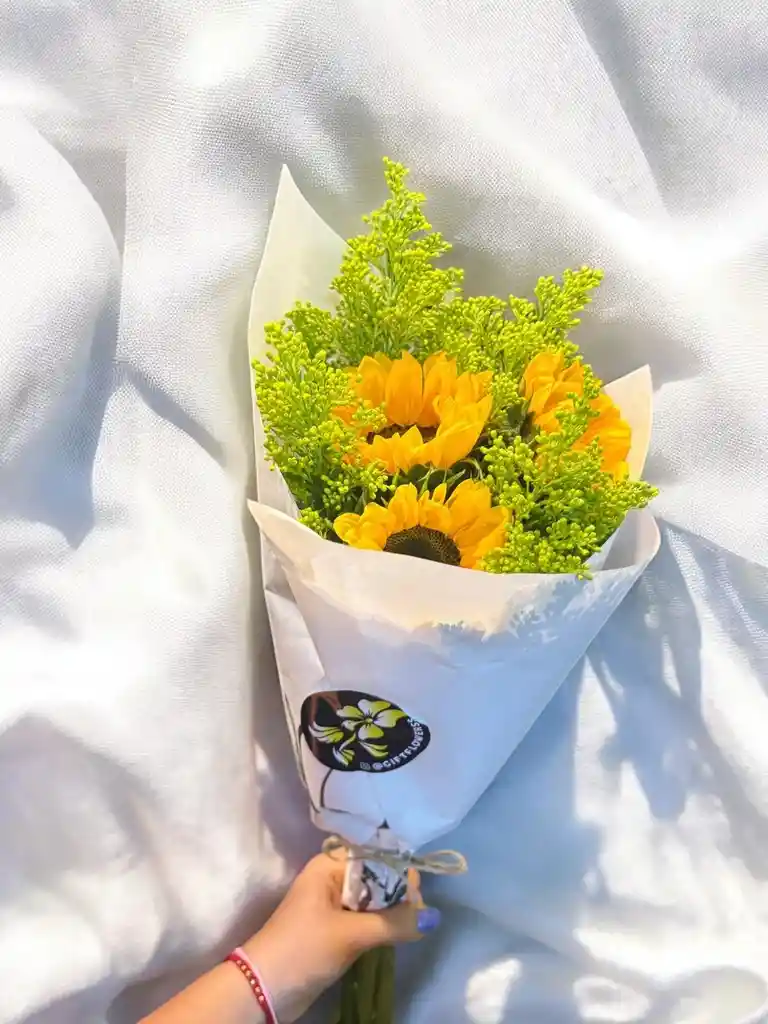 Bouquet de 3 girasoles y soliago Nota: La flor puede ser sustituida dependiendo la disponibilidad de color y del producto “Mensaje Personalizado” máximo de 30 caracteres (Dejar el mensaje en el chat, los comentarios no se previsualizan para la tienda por lo que si se dejan allí no podrá ser incluido).