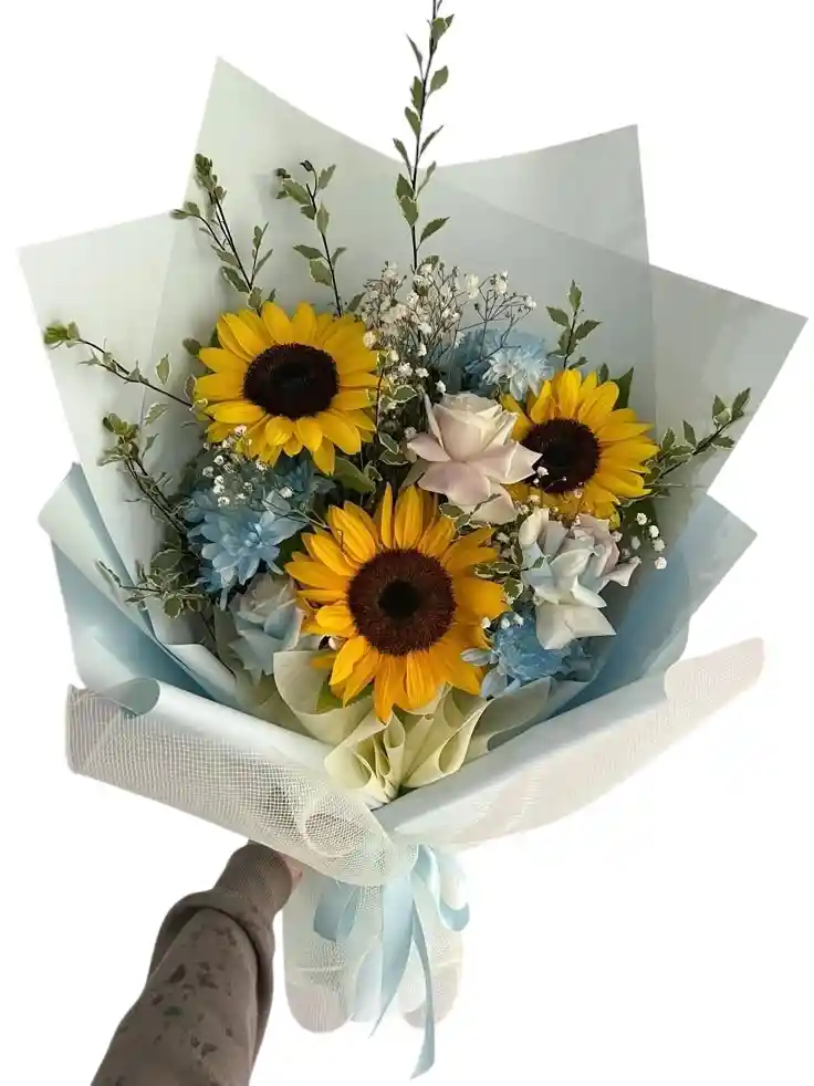 es una composición fresca y equilibrada que combina la energía vibrante de la naturaleza con una elegancia serena. El diseño destaca por tres girasoles radiantes que actúan como protagonistas, armonizados con delicadas flores en tonos azul cielo, rosas blancas de pétalos aterciopelados y sutiles toques de gipsofila.