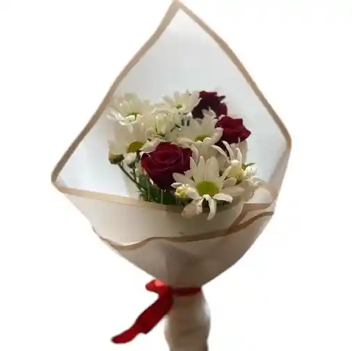 Bouquet de 3 rosas rojas y 4 margaritas, colores sujetos a disponibilidad del día, con follaje, papel y moño