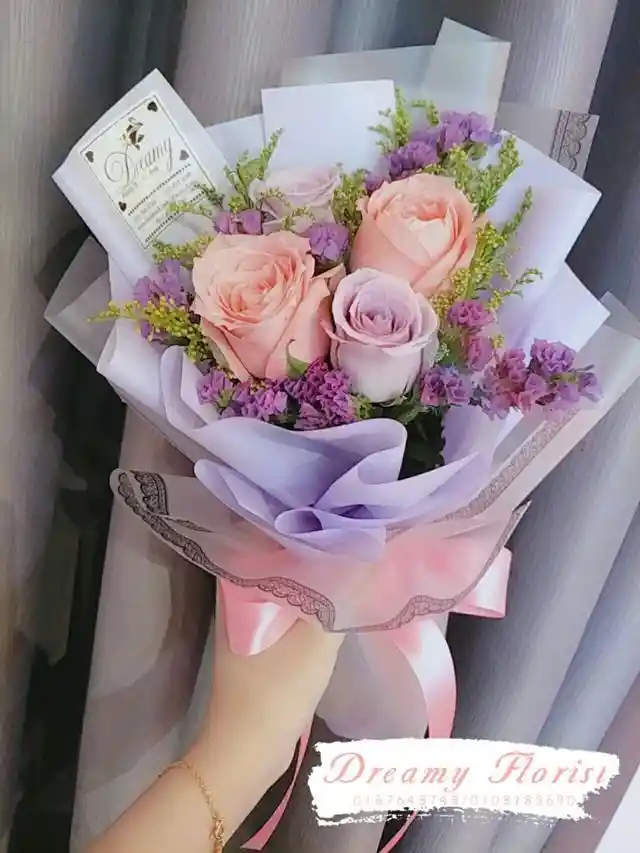 Bouquet de 3 rosas color rosado pastel con follaje de rusco o soleago, que combinan perfectamente con este espectacular color