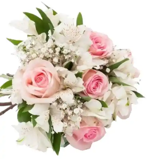 Bouquet de 4 rosas rosadas y 6 astromelias, con follaje, papel y moño