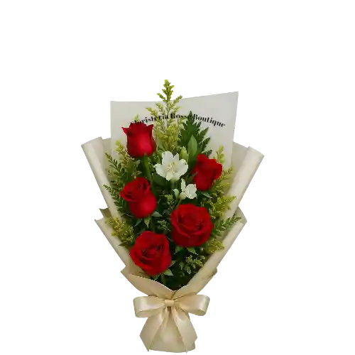 Hermoso bouquet de 5 rosas rojas frescas acompañado de delicados follajes verdes que realzan su color intenso y elegancia natural. Un detalle clásico, romántico y perfecto para cualquier ocasión especial Ideal para cumpleaños, aniversarios, detalles sorpresa o simplemente para decir “te quiero”.