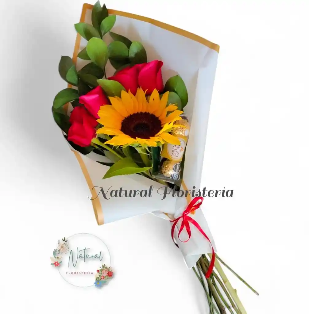 Bouquet de 5 rosas un girasol chocolates x3 en papel coreano blanco. SI DESEA ALGUNA NOTA PARA LAS FLORES DEJARLO EN DEJAR UN COMENTARIO EN AL SHOPPER, MENSAJE CORTO (TARJETA PEQUEÑA). FOTO DE REFERENCIA.