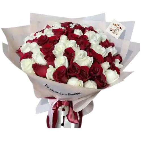 Imponente bouquet de 50 rosas combinadas entre rojas y blancas, un arreglo majestuoso que transmite elegancia, pasión y amor puro en un solo detalle. Su volumen y contraste de colores lo convierten en un regalo impactante, perfecto para sorprender en grande Ideal para aniversarios importantes, pedidas de mano, cumpleaños especiales o reconciliaciones memorables.