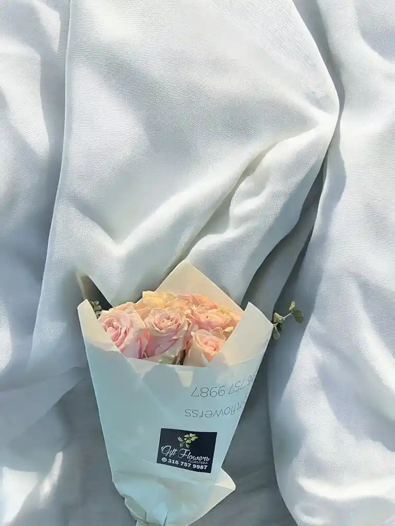 Bouquet 6 rosas rosadas con eucalipto. Nota: La flor puede ser sustituida dependiendo la disponibilidad de color y del producto “Mensaje Personalizado” máximo de 30 caracteres (Dejar el mensaje en el chat, los comentarios no se previsualizan para la tienda por lo que si se dejan allí no podrá ser incluido).