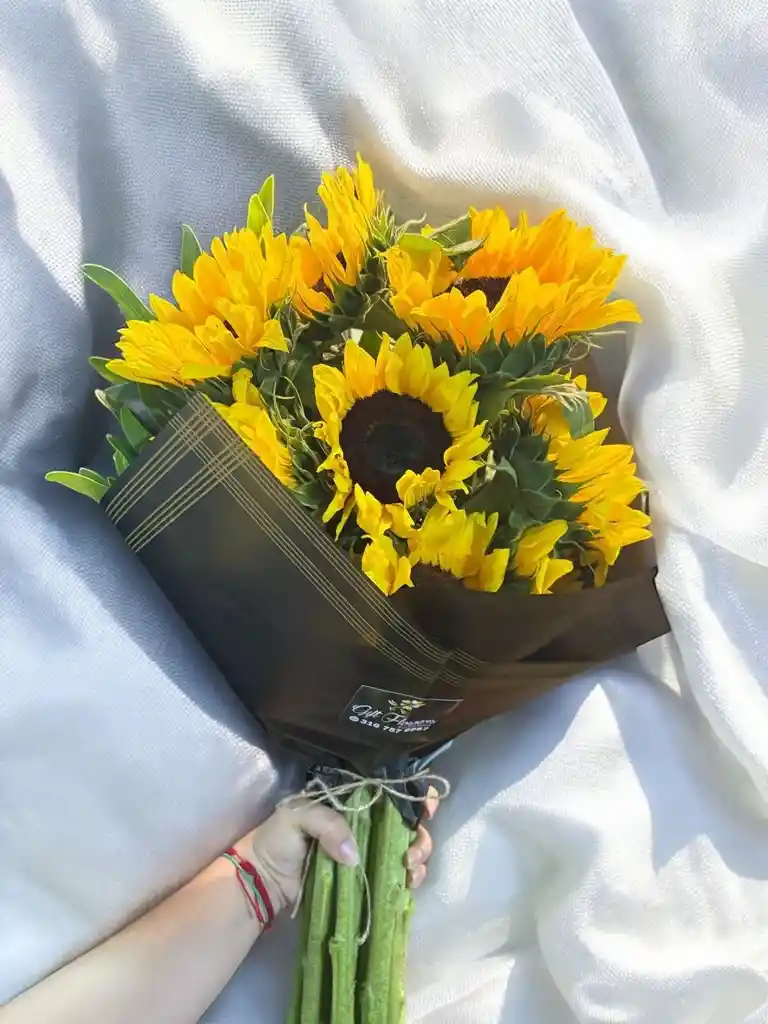 Bouquet dcon aprox. 8 girasoles. Nota: La flor puede ser sustituida dependiendo la disponibilidad de color y del producto “Mensaje Personalizado” máximo de 30 caracteres (Dejar el mensaje en el chat, los comentarios no se previsualizan para la tienda por lo que si se dejan allí no podrá ser incluido).