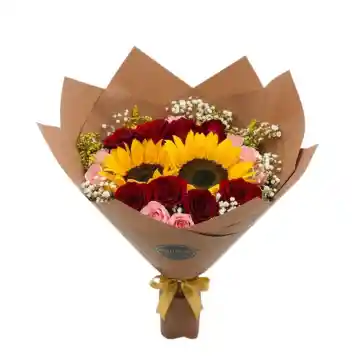 Hermoso arreglo floral de girasoles, rosas rosadas y rosas rojas