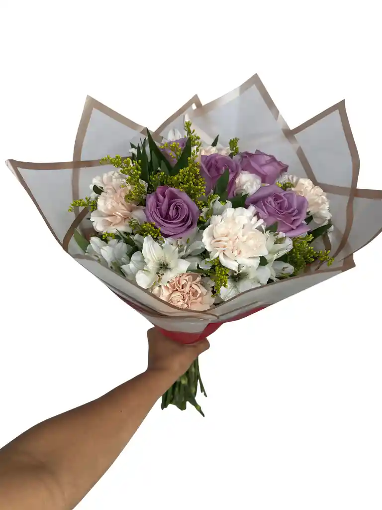 Elegante bouquet con claveles y astromelias blancas, combinado con rosas moradas frescas que aportan un toque de color y distinción. 💐✨ Ideal para regalar serenidad, agradecimiento o amor sincero en cualquier ocasión especial.