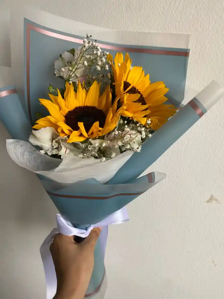 Ramo de girasoles como flores amarillas adornada o astromelias tipo exportación y jipsu filia blanco envuelto en papel coreano con una mariposa en el diseño, ideal para el día de flores amarillas u cualquier ocasión que quieras resalta la lealtad el amor y los sentimientos esleciafes hacia alguien
