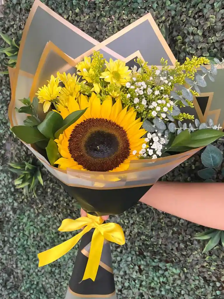 Bouquet de flores amarillas, girasol. solidago, pompones amarillos y margaritas amarillas