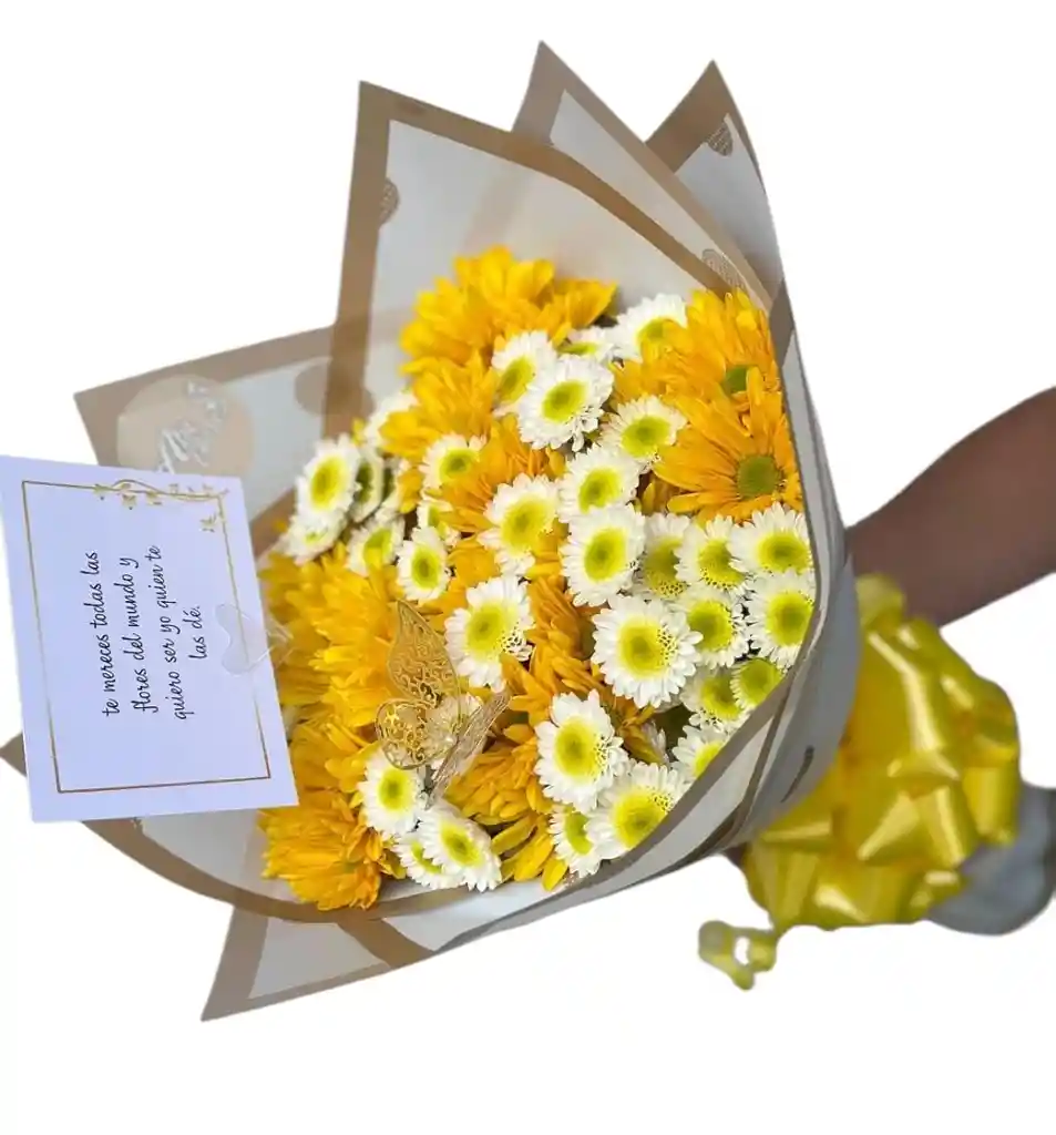 Bouquet de Flores Amarillas , moño y follaje, si deseas agregar algún mensaje no dudes e escribirnos. de color Amarillo ideal para el Agradecimiento
