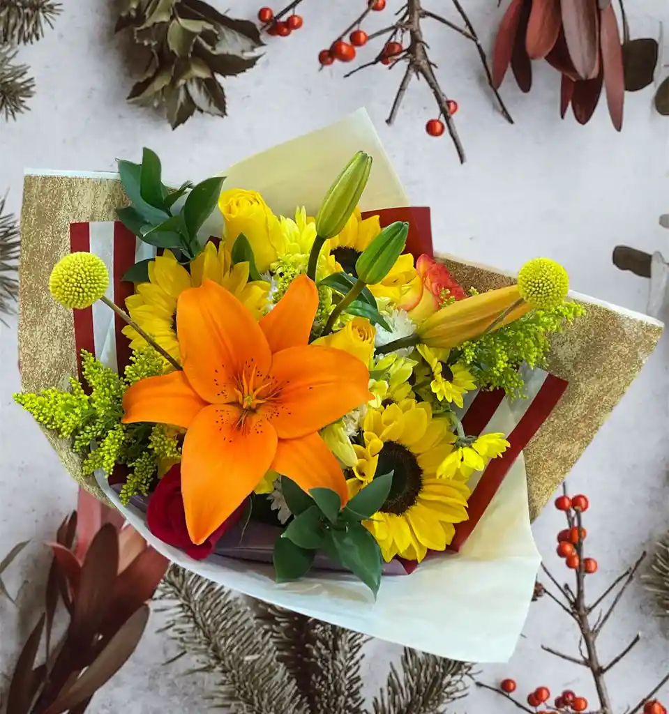 Lindo Bouquet de flores frescas y seleccionadas de alta calidad. Perfectas para decorar estas navidad tu hogar o regalar. Tallo Largo y Boton Grande, para mayor duracion y linda apertuta, acompañada de margaritas, lirios, rosas, mini girasoles, craspedias y follaje Amarillo. Incluye Moño, y Tarjeta de Regalo Personalizado, y un sobre de vitaminas para preservar tus flores. Enviaremos colores surtidos ideales para navidad