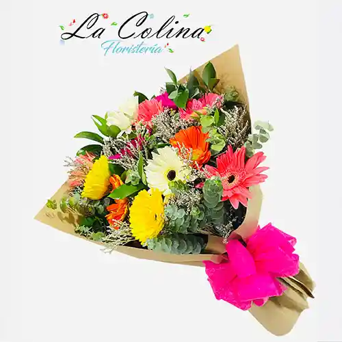 Bouquet de 12 Gérberas decorado con Caspia, ruscu, eucalipto con un papel Kraft y moño en interlón Las Gérberas son un lindo detalle especial para sorprender, ya que iluminan cualquier ambiente del hogar.