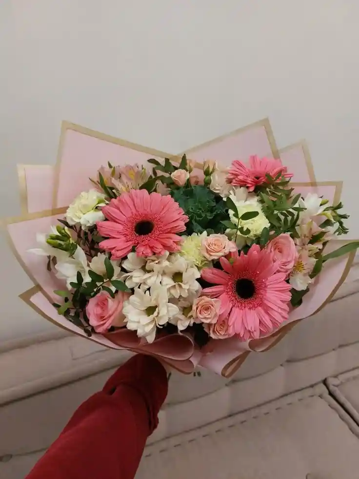 Bouquet de 3 gérberas con rosa mini Nota: La flor puede ser sustituida dependiendo la disponibilidad de color y del producto “Mensaje Personalizado” máximo de 30 caracteres (Dejar el mensaje en el chat, los comentarios no se previsualizan para la tienda por lo que si se dejan allí no podrá ser incluido).