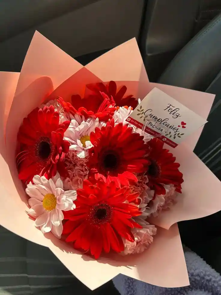 Bouquet de 6 gérberas rojas y 1 paquete de margaritas Nota: La flor puede ser sustituida dependiendo la disponibilidad de color y del producto “Mensaje Personalizado” máximo de 30 caracteres (Dejar el mensaje en el chat, los comentarios no se previsualizan para la tienda por lo que si se dejan allí no podrá ser incluido).