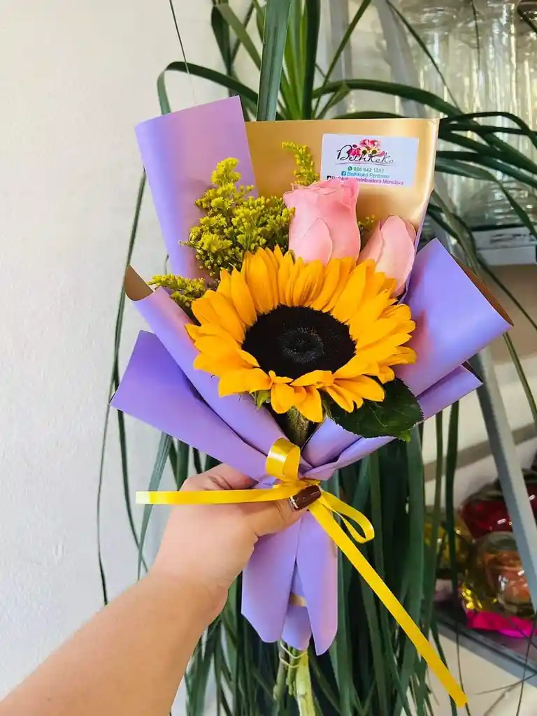 Un encantador ramo de un girasol y rosas , perfecto para cualquier ocasión. Incluye un girasol grande, acompañado de dos rosas de un delicado color rosa, follaje de solidago y rusco .