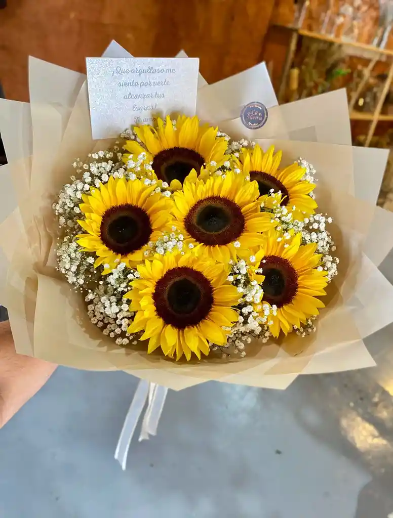 Un ramo radiante que es pura felicidad. Este diseño cuenta con seis luminosos girasoles que simbolizan la alegría, la admiración y la buena energía.
