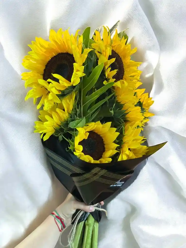Bouquet con aprox. 7 girasoles y alas de hada. Nota: La flor puede ser sustituida dependiendo la disponibilidad de color y del producto “Mensaje Personalizado” máximo de 30 caracteres (Dejar el mensaje en el chat, los comentarios no se previsualizan para la tienda por lo que si se dejan allí no podrá ser incluido).