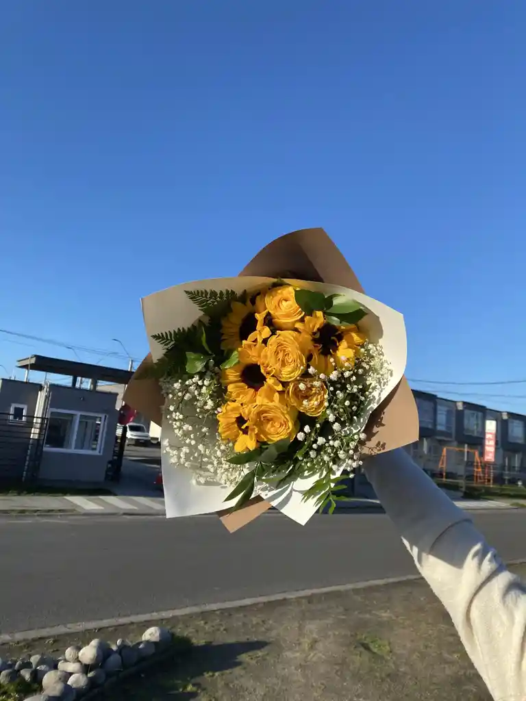 Bouquet de 4 girasoles y 6 rosas amarillas. La flor puede ser sustituida dependiendo la disponibilidad de color y del producto “Mensaje Personalizado” máximo de 30 caracteres (Dejar el mensaje en el chat, los comentarios no se previsualizan para la tienda por lo que si se dejan allí no podrá ser incluido).