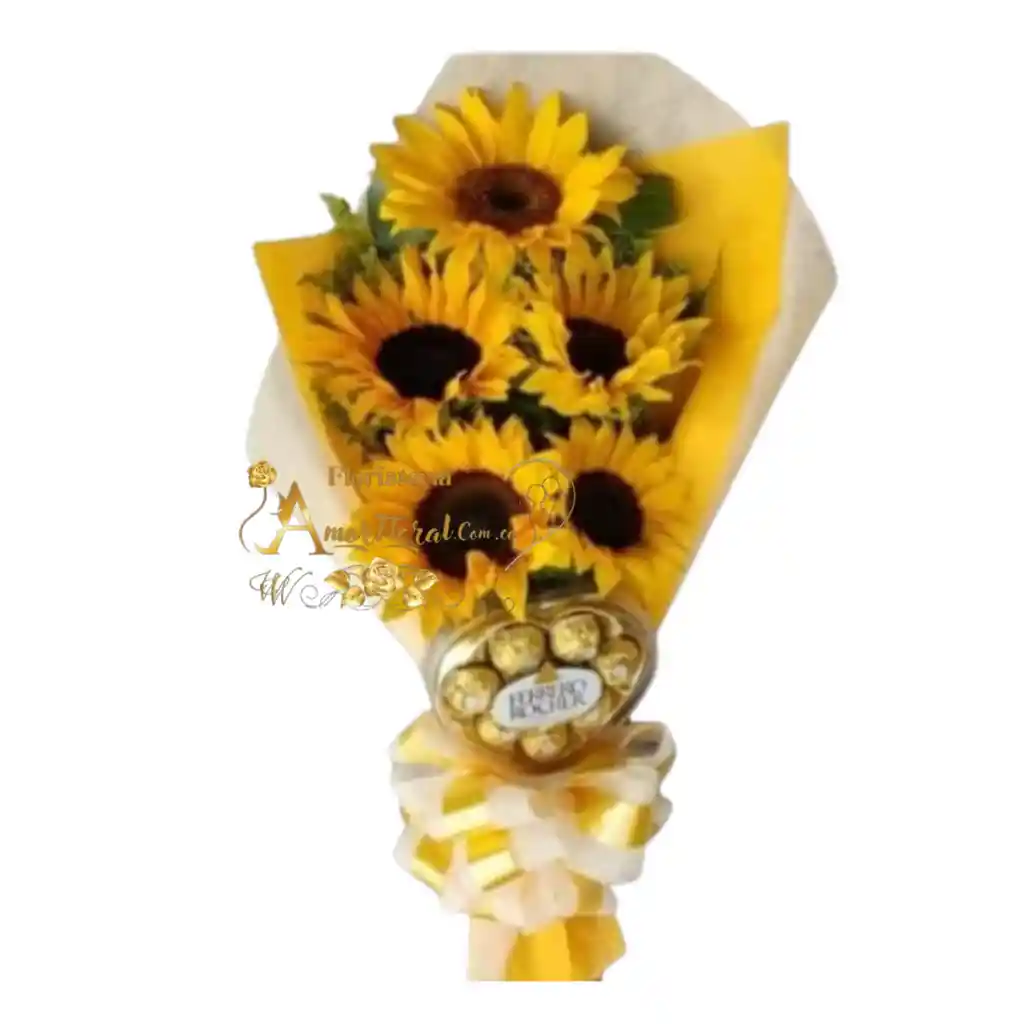 bouquet por 5 girasoles y ferrero por 8 en estuche de corazón, si deseas un mensaje para la tarjeta lo puedes dejar escrito en el área de observaciones o escribirnos al whatsapp al 3143111616 y enviarnos el mensaje para la tarjeta.