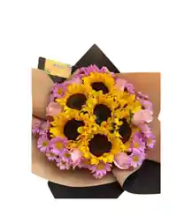 Bouquet de 7 girasoles margarita y 6 rosas Nota: La flor puede ser sustituida dependiendo la disponibilidad de color y del producto “Mensaje Personalizado” máximo de 30 caracteres (Dejar el mensaje en el chat, los comentarios no se previsualizan para la tienda por lo que si se dejan allí no podrá ser incluido).