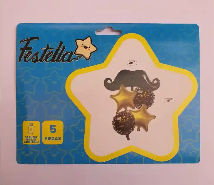 Bouquet de Globos Feliz Cumpleaños Bigote Estrellas Doradas X 5 Piezas Festella