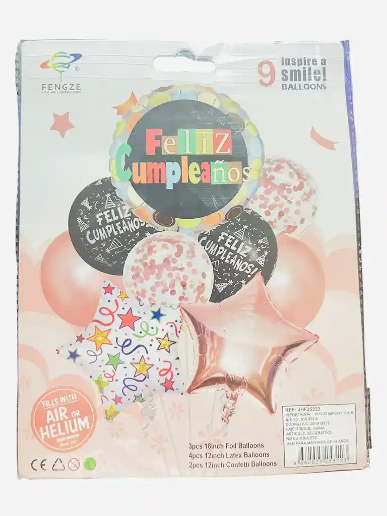 Bouquet de globos feliz cumpleaños 9 oro rosa negro