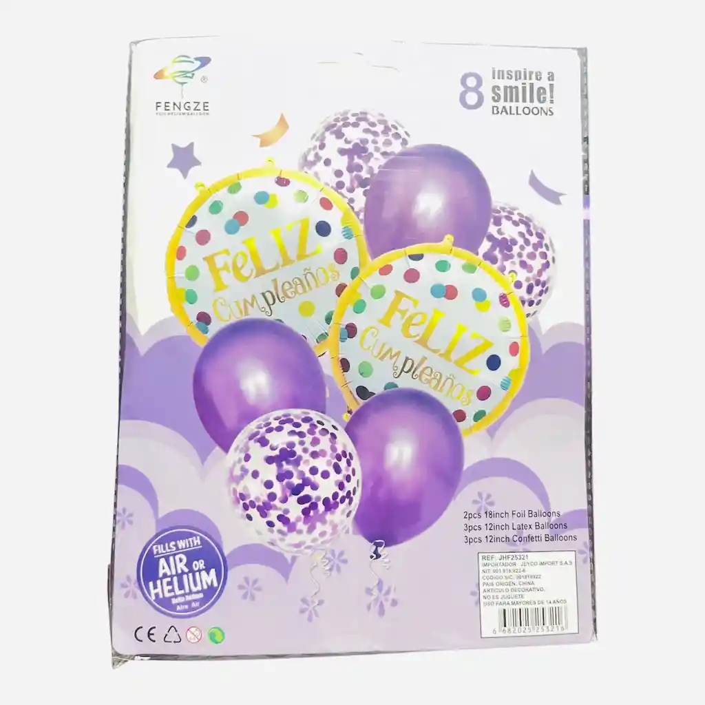 Bouquet de globos feliz cumpleaños 8 piezas morado blanco