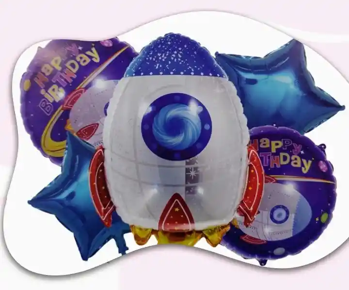 CARACTERÍSTICAS DEL SET 5 Piezas •2 Globos redondos metalizados 45cm con diseño Feliz Cumpleaños •2 estrellas metalizadas 45cm, Azul •1 Globo forma de Cohete de 60 x 75 cm aprox Los niños menores de ocho años pueden asfixiarse o sofocarse con globos sin inflar o rotos. Es necesaria la vigilancia de una persona adulta. Mantén los globos sin inflar fuera del alcance de los niños. Desecha inmediatamente los globos rotos. -Autosellante -Reutilizable