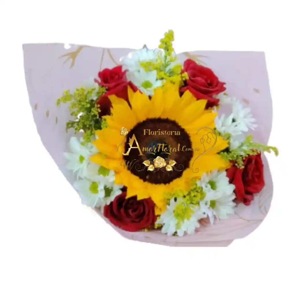 bouquet por 4 rosas, margaritas, 1 girasol, si deseas un mensaje para la tarjeta lo puedes dejar escrito en el área de observaciones o escribirnos al whatsapp al 3143111616 y enviarnos el mensaje para la tarjeta.