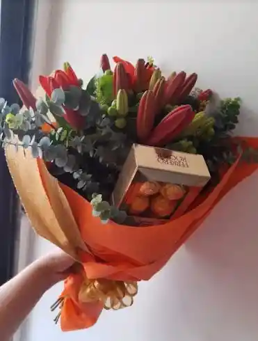 Lirio japonés, combinado con hipérico, eucalipto, soliaster o follaje disponible mas una caja de ferreros rocher, envoltura en tela y moño .