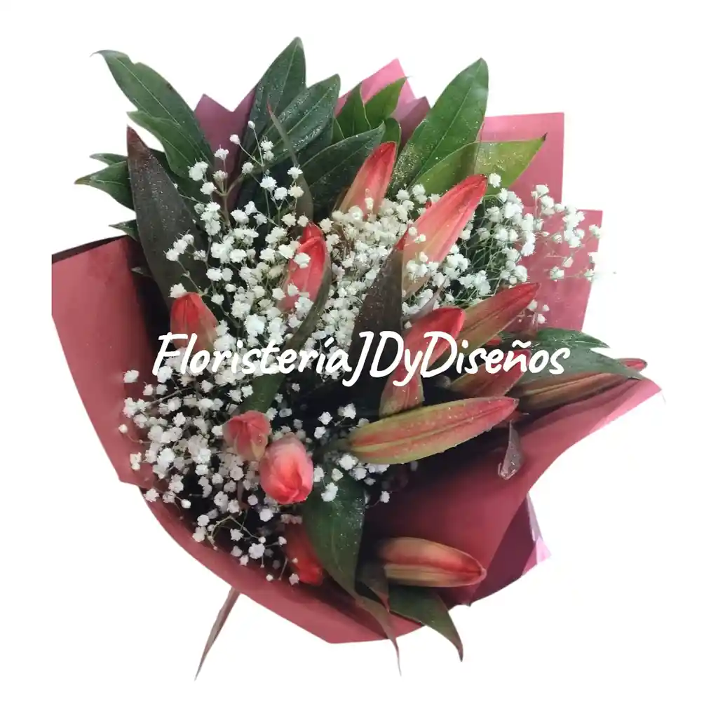 BOUQUETS DE LIRIOS TIPO EXPORTACION(OLANDEZ), CON FALLAJE, ORGANIZADO CON PAPEL COREANO Y MOÑO EN CINTA DE PAPEL