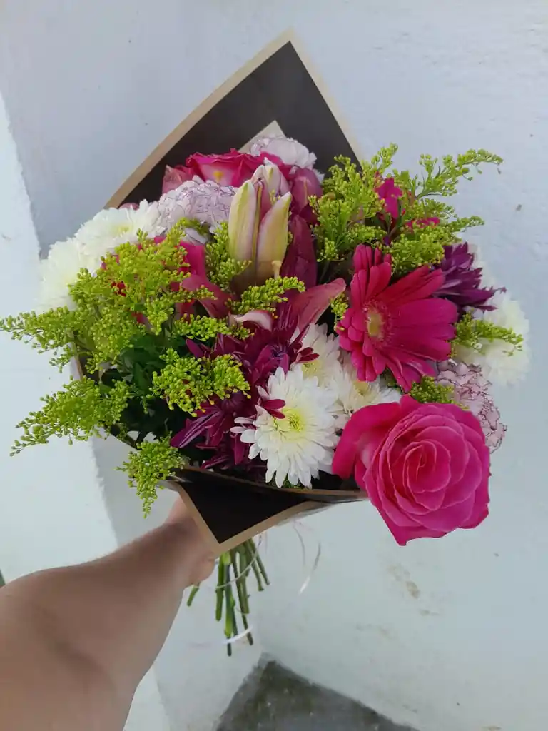 Imagina un bouquet donde los lirios rosados son el protagonista indiscutible. Sus pétalos suaves y delicados se abren en una forma majestuosa, creando una presencia impresionante. Cada tallo lleva consigo múltiples flores, formando un conjunto exuberante y lleno de vida.