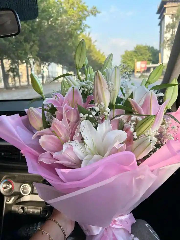 Bouquet de 5 varas de lirios rosados y gypsophila Nota: La flor puede ser sustituida dependiendo la disponibilidad de color y del producto “Mensaje Personalizado” máximo de 30 caracteres (Dejar el mensaje en el chat, los comentarios no se previsualizan para la tienda por lo que si se dejan allí no podrá ser incluido).