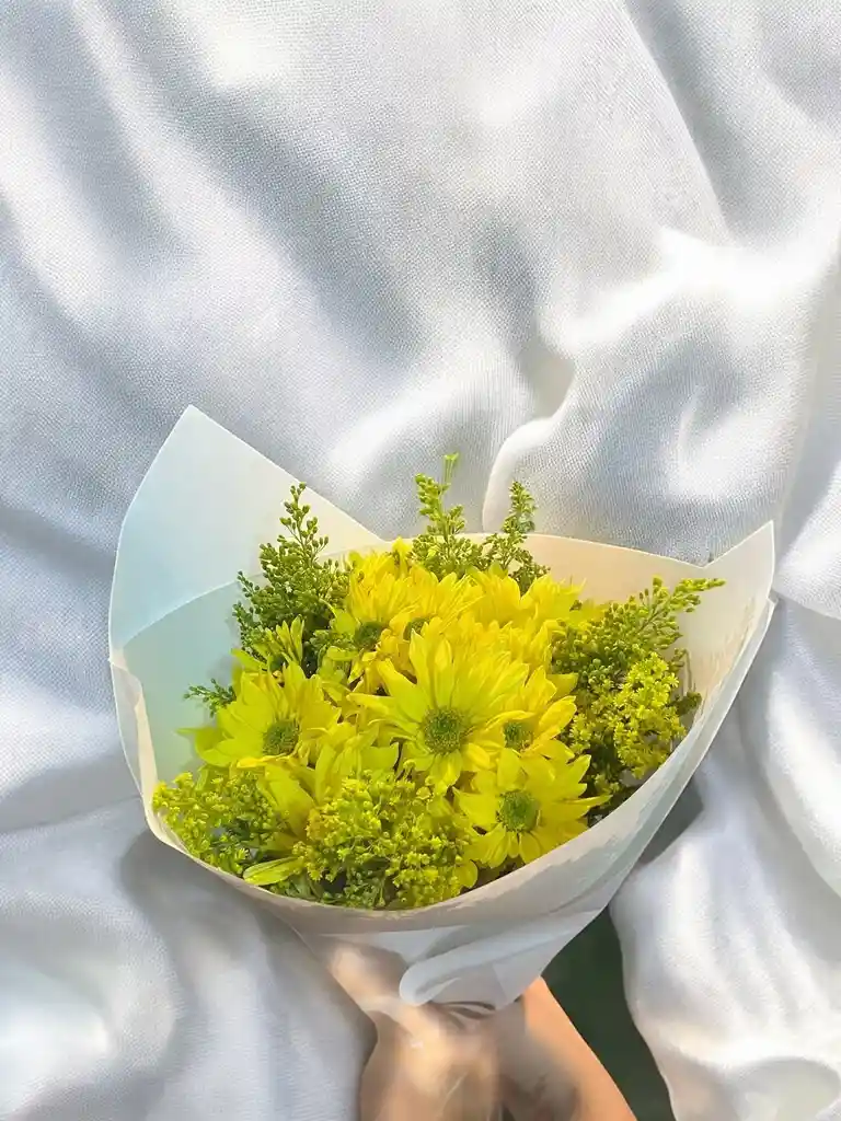 Bouquet de margarita amarilla acompañadas de solidago. Nota: La flor puede ser sustituida dependiendo la disponibilidad de color y del producto “Mensaje Personalizado” máximo de 30 caracteres (Dejar el mensaje en el chat, los comentarios no se previsualizan para la tienda por lo que si se dejan allí no podrá ser incluido).