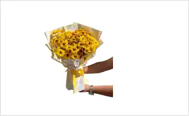 Bouquet de margaritas amarillas. La flor puede ser sustituida dependiendo la disponibilidad de color y del producto “Mensaje Personalizado” máximo de 30 caracteres (Dejar el mensaje en el chat, los comentarios no se previsualizan para la tienda por lo que si se dejan allí no podrá ser incluido).