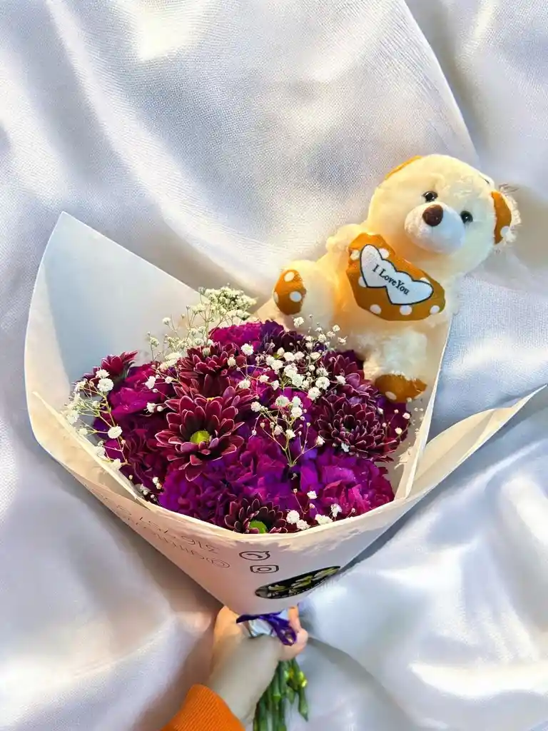 Bouquet de margaritas y 8 claveles moradas acompañadas de gypsophilia, con un oso pequeño. Nota: La flor puede ser sustituida dependiendo la disponibilidad de color y del producto “Mensaje Personalizado” máximo de 30 caracteres (Dejar el mensaje en el chat, los comentarios no se previsualizan para la tienda por lo que si se dejan allí no podrá ser incluido).