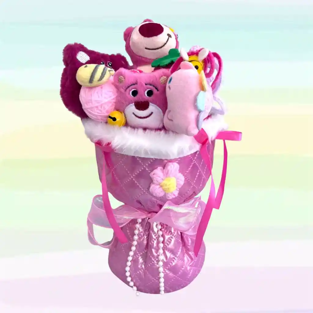 Este encantador bouquet de peluches Lotso reúne varios mini ositos rosados inspirados en el inolvidable personaje de Toy Story. Un regalo original, suave y adorable, ideal para fans de Disney, amantes de los peluches o para sorprender con un detalle único y duradero. ¡Porque no todo bouquet necesita flores para enamorar!