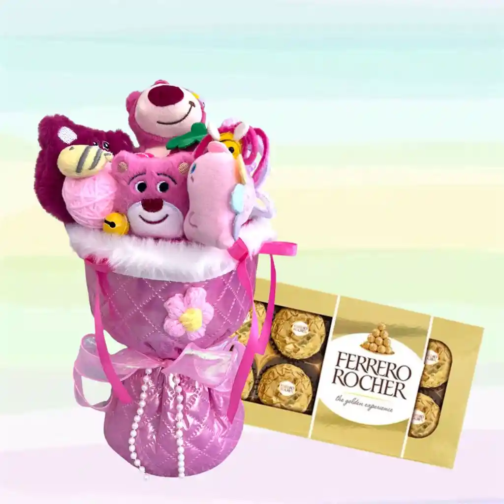 La mezcla perfecta entre dulzura y ternura. Este bouquet de peluches Lotso viene acompañado de una caja de Ferrero Rocher, creando una presentación irresistible para quienes aman los regalos que derriten el corazón (¡y el paladar!). Ideal para cumpleaños, detalles románticos o para consentir con estilo.