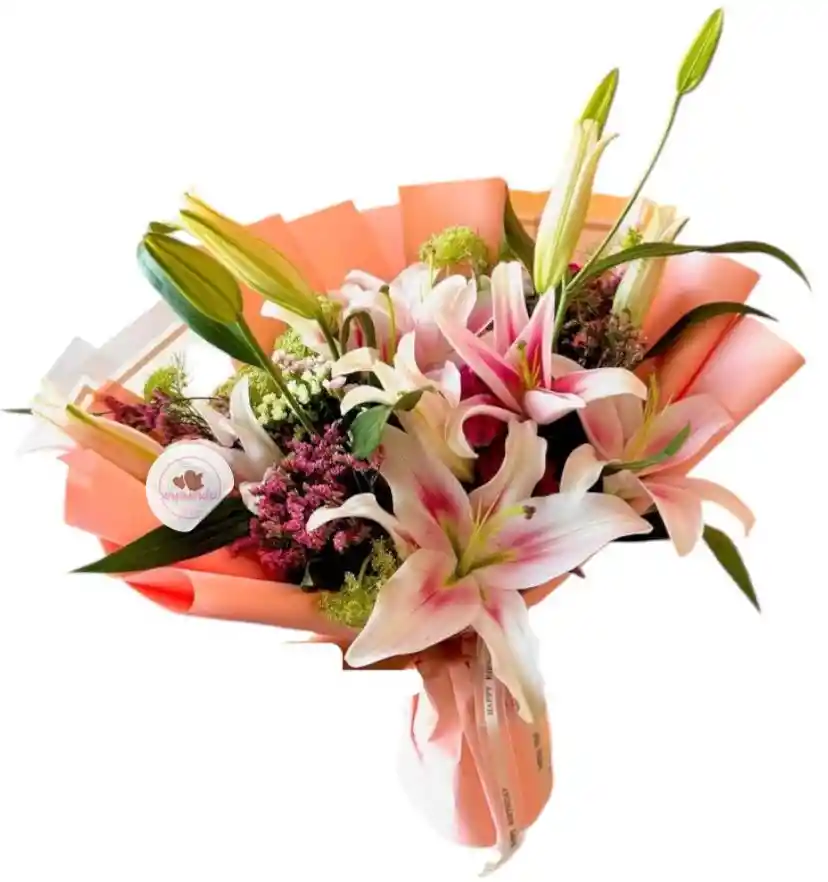Sorprende sin motivo con la belleza atemporal de nuestras flores. Son un mensaje del corazón que aporta pura alegría a cualquier ocasión." BOUQUET CON.:LIRIOS,SIEMPRE VIVA, FOLLAJE,PAPEL DECORATIVO Y MOÑO