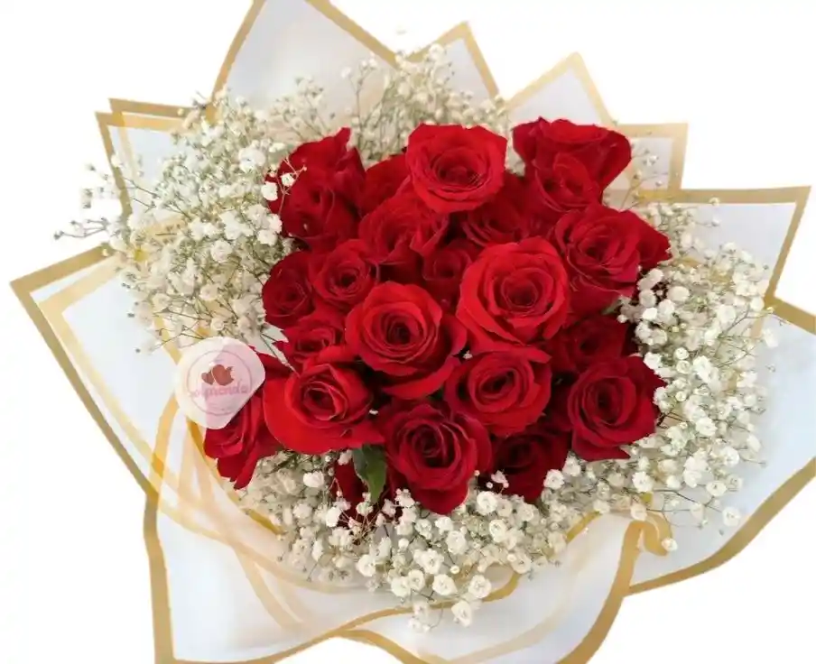 "La esencia del romance en cada pétalo. Nuestro bouquet de rosas es el regalo perfecto para cualquier ocasión, a un precio increíble." BOUQUET CON; 24 ROSAS ,PERLA ,PAPEL DECORATIVPO Y MOÑO